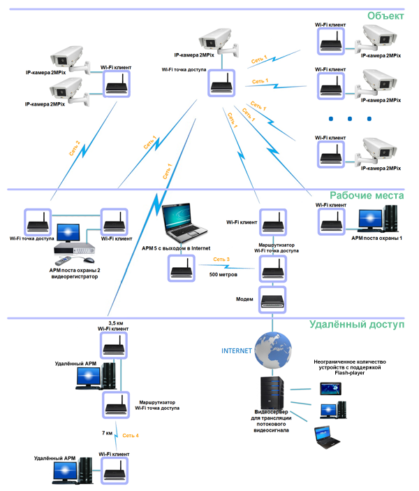 Создание Wi-Fi сети на объекте позволило избежать трудоёмкой и дорогостоящей прокладки проводов и безболезненно увеличить дальность от камер до рабочих мест. При проводном подключении сети Ethernet расстояние между коммутаторами не может быть больше 100 метров, на объекте же минимальное расстояние между оборудованием составляет 170 метров, максимальное — 7 километров.